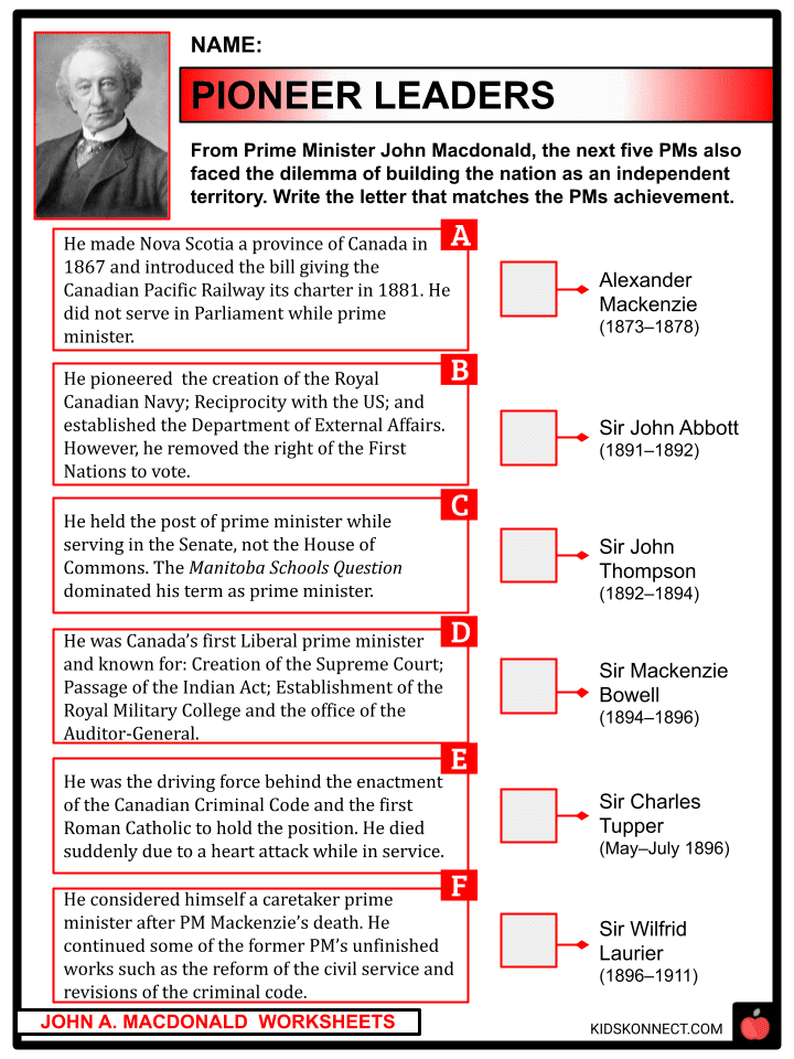Here is the description of "John A. Macdonald" in the context of "Canadian Prime Ministers": John A. Macdonald was born in Scotland in 1815 and immigrated to Canada as a child He became a lawyer and entered politics, serving as prime minister from 1867 to 1873 Macdonald is often considered one of the founding fathers of Canada due to his role in forming Confederation He was instrumental in building the country's infrastructure, including the Canadian Pacific Railway Macdonald served a total of four non-consecutive terms as prime minister, from 1867 to 1873 and again from 1878 to 1891