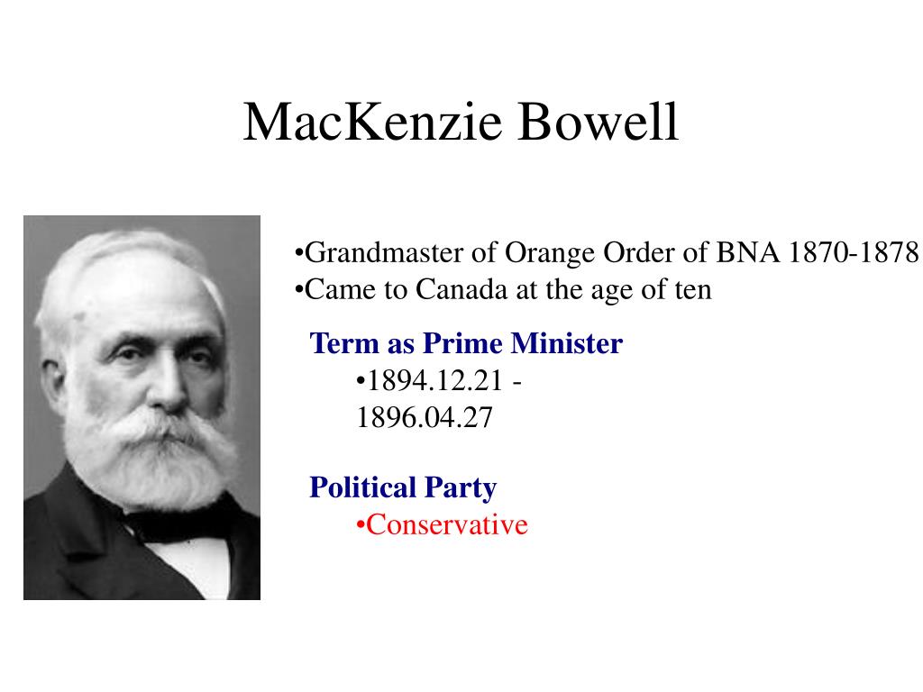 Mackenzie Bowell was the eighth Prime Minister of Canada from December 21, 1894, to April 27, 1896. He led a minority government during a tumultuous period in Canadian history. His tenure was marked by economic uncertainty and growing tensions between English- and French-speaking Canadians.