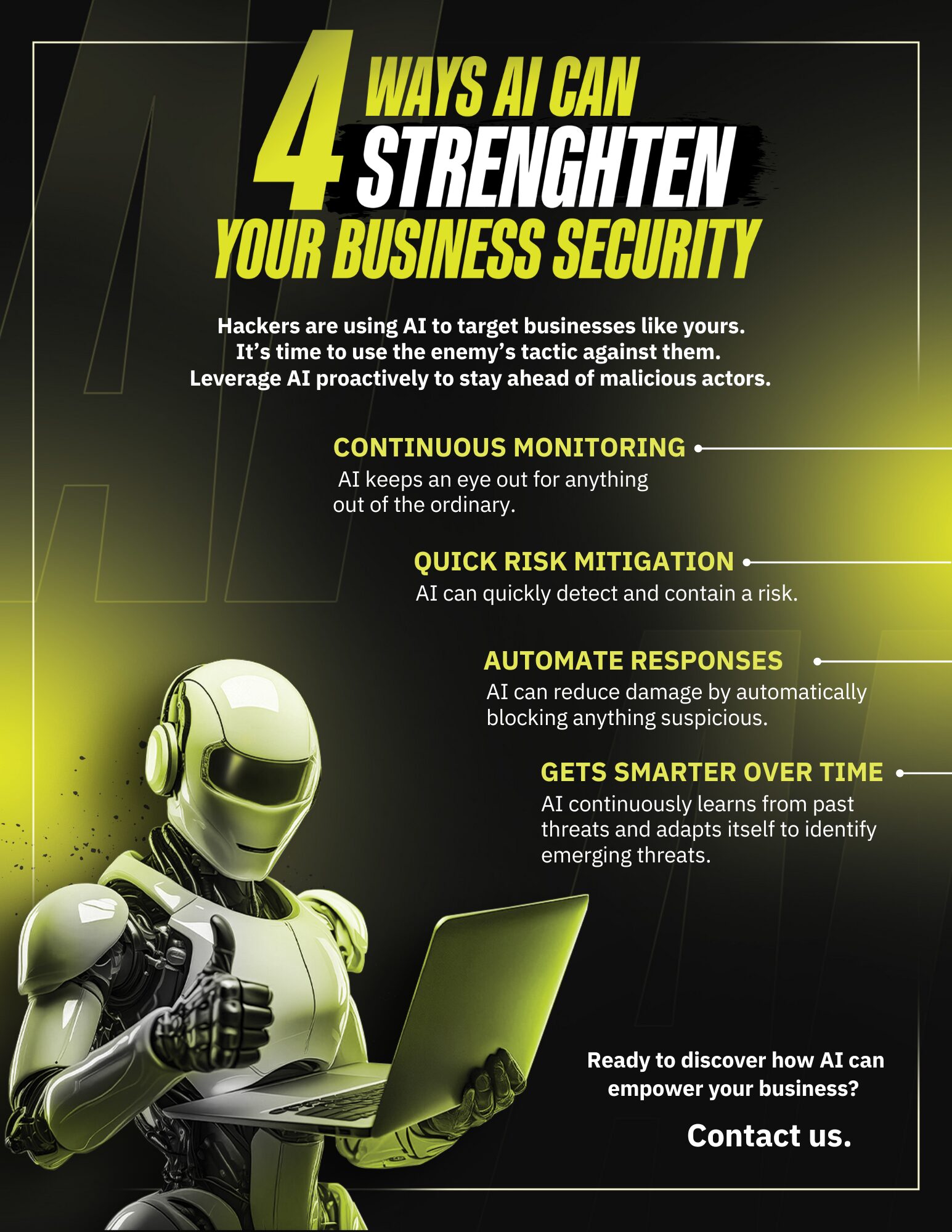 Artificial intelligence in business is a subset of computer technology that leverages machine learning algorithms to automate decision-making processes By analyzing large datasets, AI systems can identify patterns and make predictions, enabling businesses to optimize operations and improve customer experiences AI-powered chatbots are increasingly used in customer service, providing personalized support and reducing response times Businesses are also leveraging AI for predictive maintenance, detecting equipment failures before they occur and minimizing downtime In the finance sector, AI-driven algorithms analyze market trends and sentiment to inform investment decisions and reduce risk AI-powered marketing analytics help businesses identify target audiences and optimize ad spend, resulting in increased conversions and revenue As AI capabilities continue to evolve, businesses are exploring its potential applications in areas like supply chain management, HR, and more