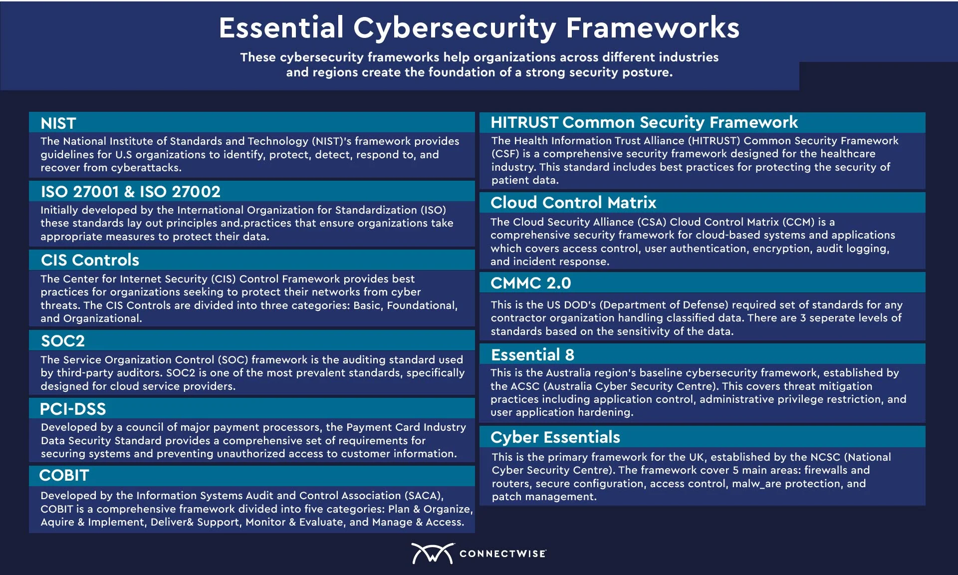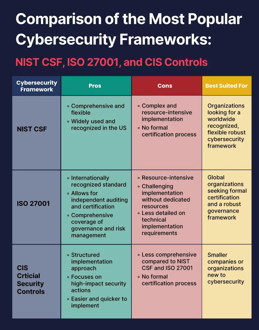 Cybersecurity frameworks provide a structured approach to managing cybersecurity risks within an organization. These frameworks help organizations develop a cohesive strategy for protecting sensitive information and mitigating potential threats. NIST's Cybersecurity Framework (CSF) is a widely adopted framework that offers guidelines for managing and reducing cybersecurity risk. The CSF consists of five core functions: Identify, Protect, Detect, Respond, and Recover, which help organizations prioritize their cybersecurity efforts. ISO 27001 is another well-known framework that provides best practices for implementing an Information Security Management System (ISMS). Frameworks like the SOC for Cybersecurity offer a standardized approach to managing and reporting on cybersecurity risks and controls. Using a cybersecurity framework can help organizations reduce their attack surface, detect threats more effectively, and respond quickly in the event of a breach.