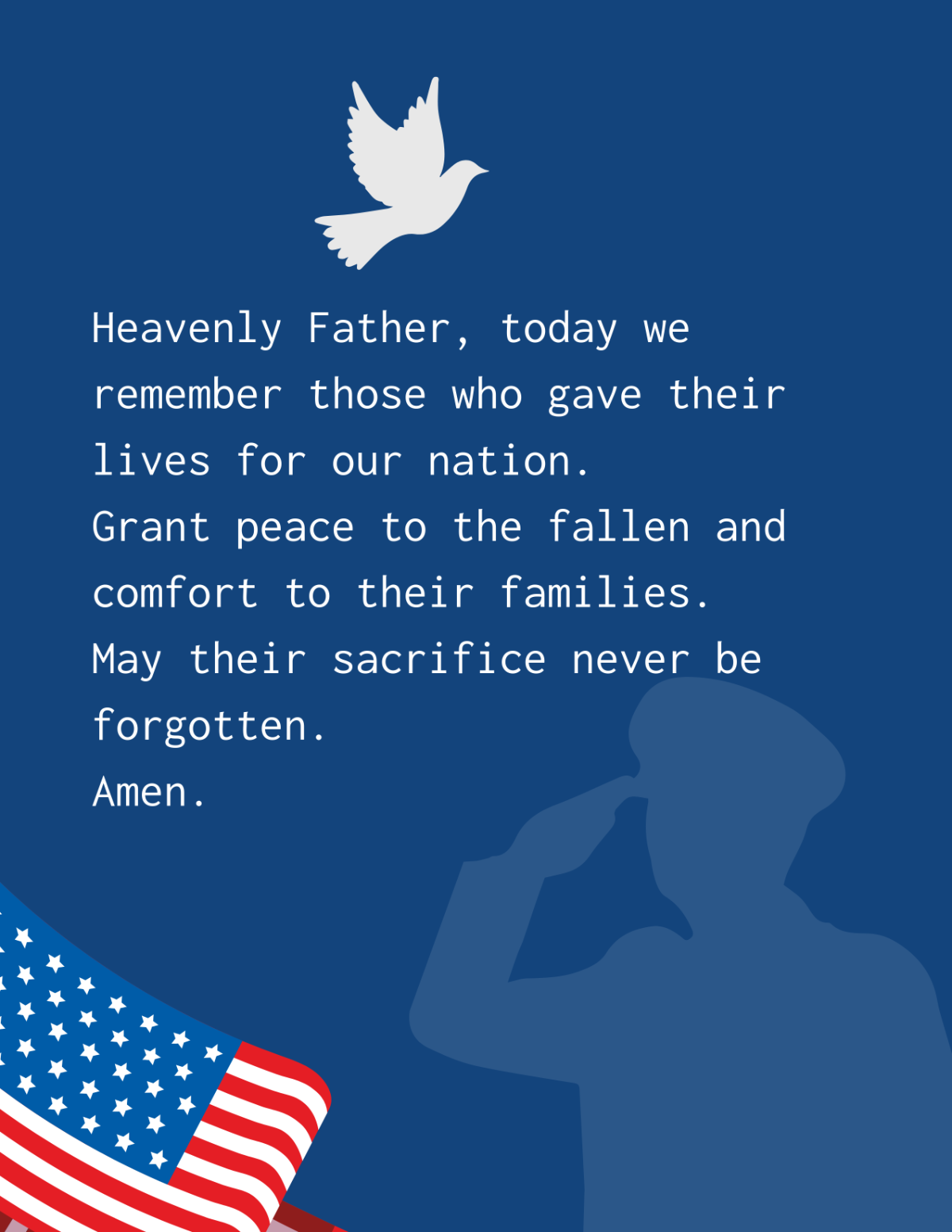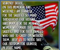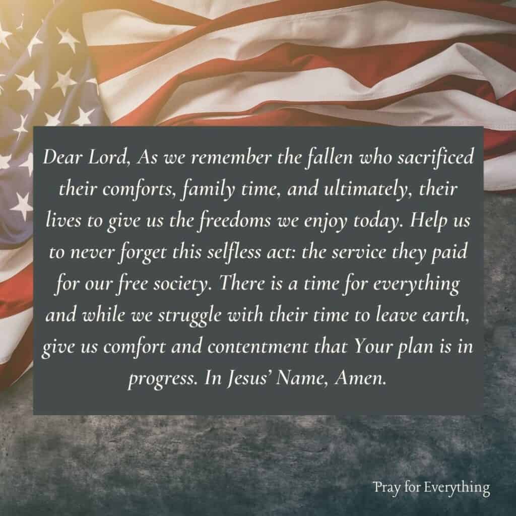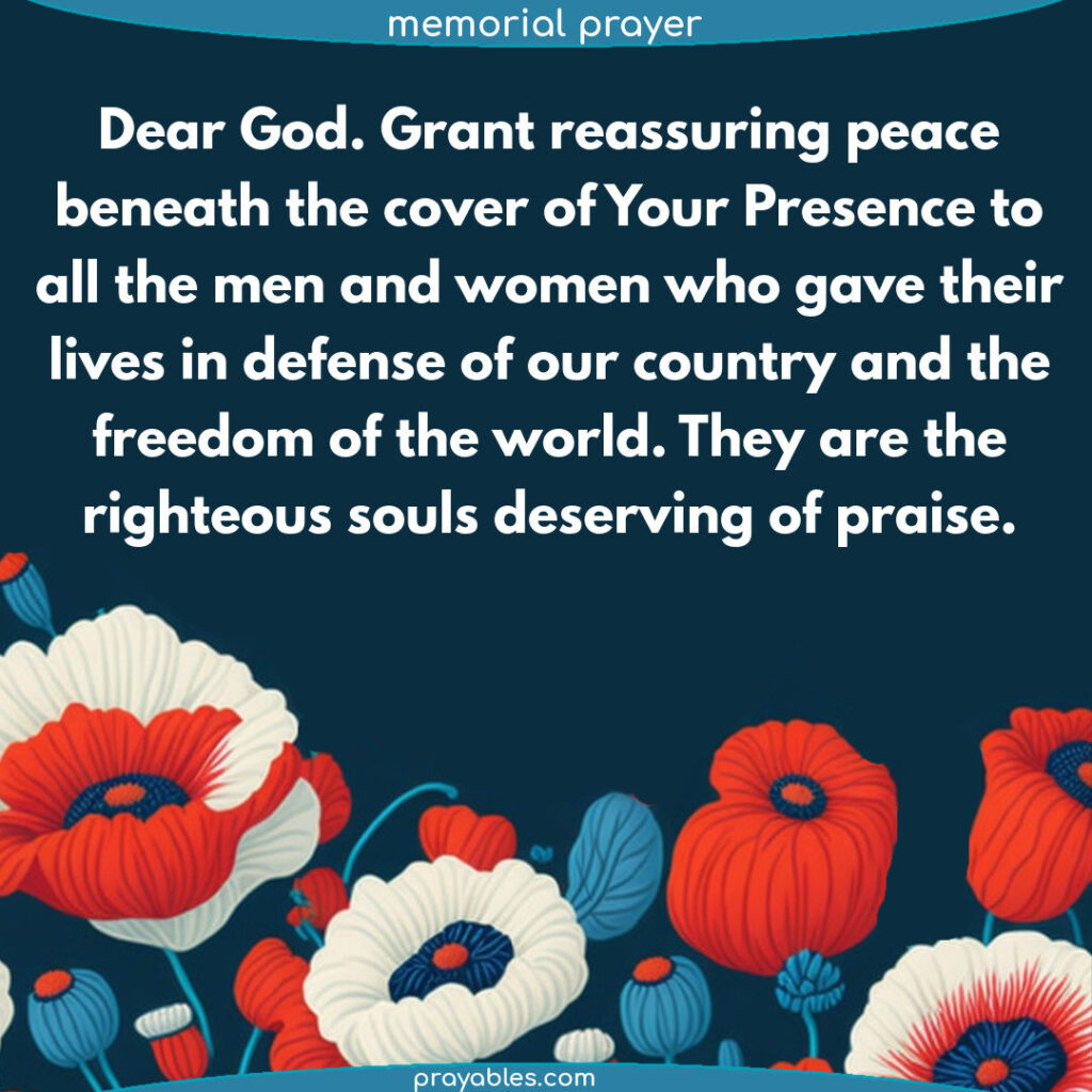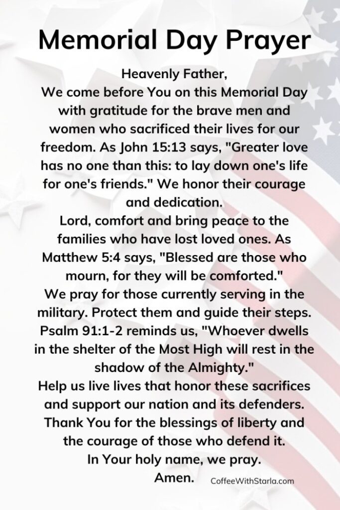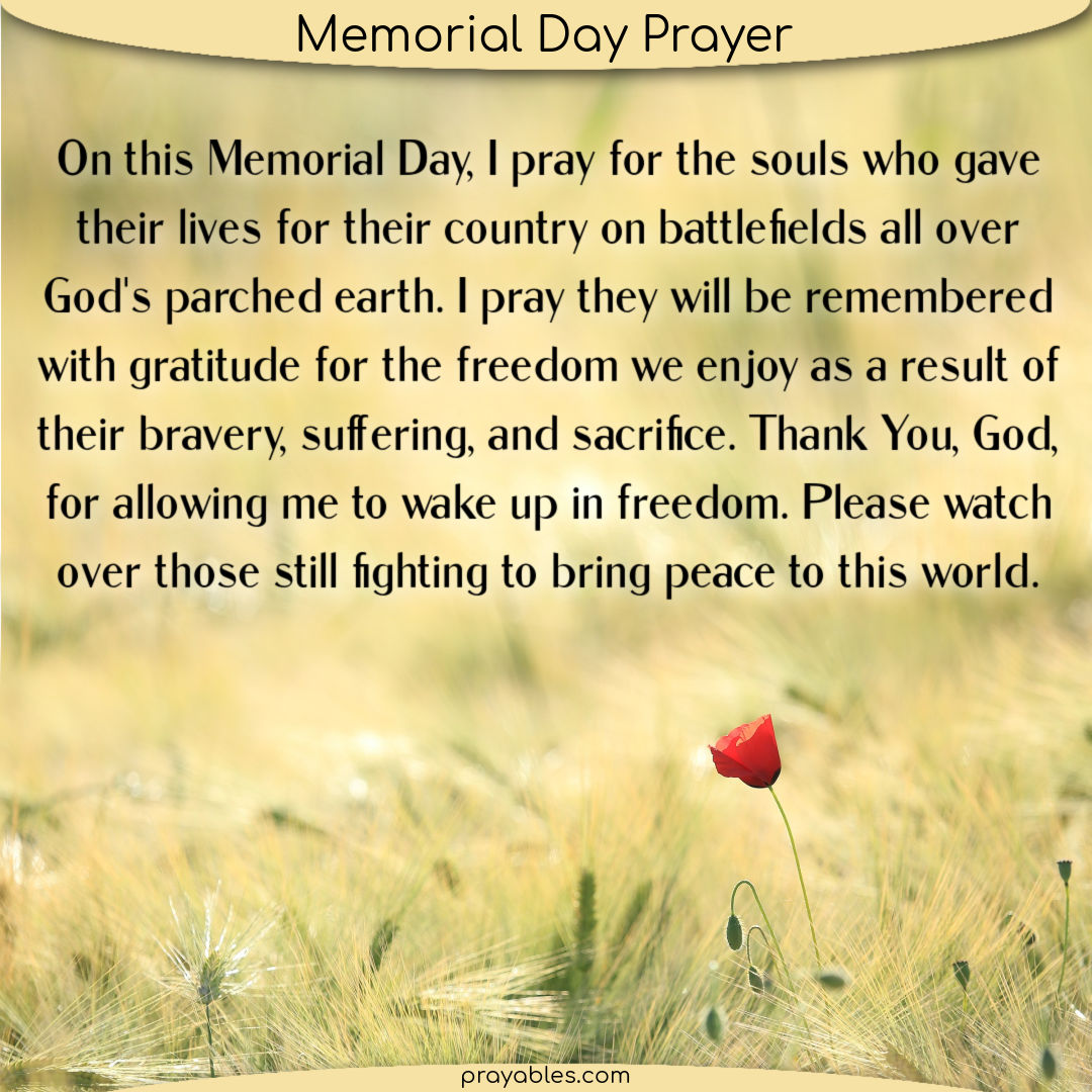 Here are some descriptions of "Memorial Day Prayers" in the context of Memorial Day: As Americans gather to honor fallen heroes, prayers are said to acknowledge their sacrifice and seek guidance for a nation at peace . Memorial Day prayers often begin with gratitude for the freedoms we enjoy today, thanks to those who have given their last full measure of devotion . Prayers may also ask for wisdom in guiding our country's leaders as they make decisions that impact our collective future . In times of conflict and uncertainty, Memorial Day prayers seek comfort and solace from a higher power, acknowledging the sacrifices made by those who have served and continue to serve . For many families, Memorial Day is a time to reflect on their personal connections to military service, offering prayers for loved ones still serving or those who have returned home .