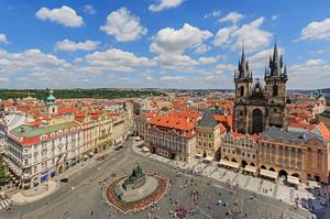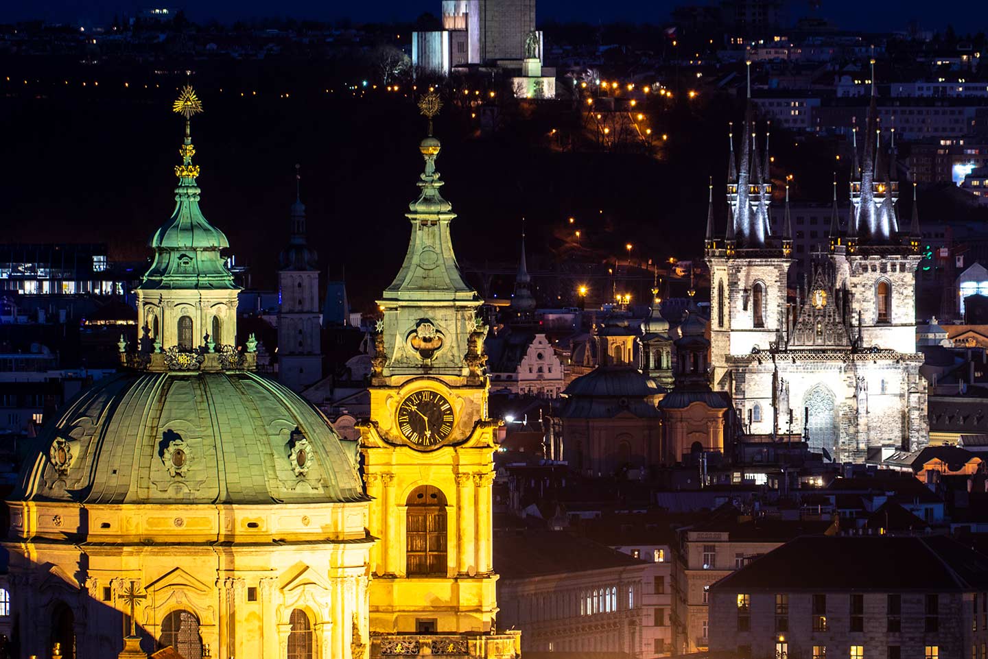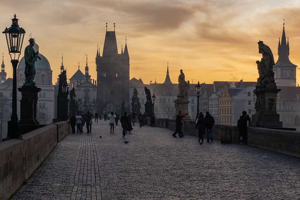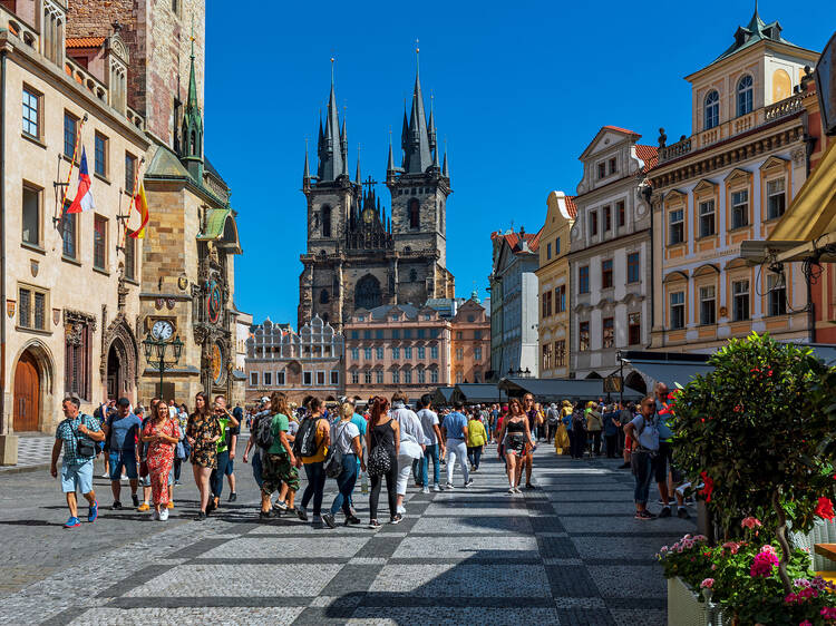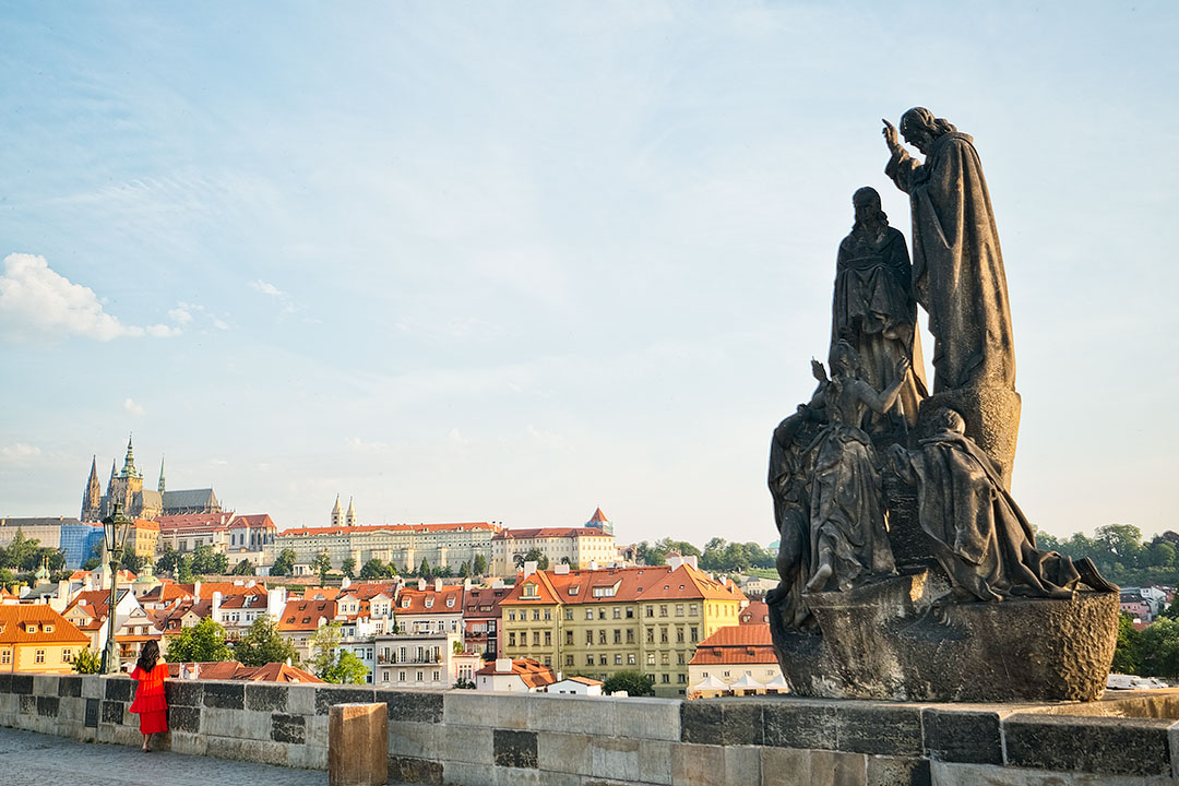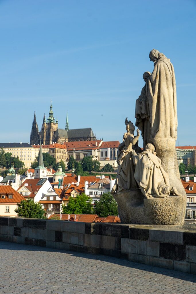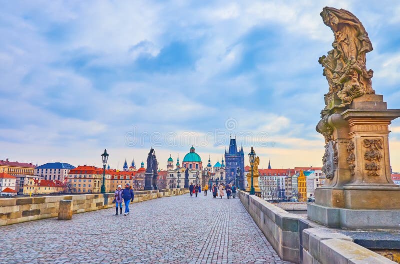 Here is a description of famous landmarks in Prague: The Charles Bridge is a iconic landmark connecting the Old Town to the Lesser Town district, lined with statues and offering stunning views of the Vltava River PetÅ™Ãn Tower is a miniature version of the Eiffel Tower, standing 60 meters tall and offering panoramic views of the city from its observation deck St. Nicholas Church in Prague's Old Town Square is a beautiful Baroque church with intricate stone carvings and ornate decorations The Old Town Hall, also located in Prague's Old Town Square, features a stunning Gothic facade and a famous astronomical clock that dates back to the 15th century The Jewish Quarter, including the Spanish Synagogue and the Pinkas Synagogue, is a significant cultural and historical landmark, showcasing the city's rich Jewish heritage Wenceslas Square is one of Prague's largest public spaces, featuring the National Museum, the statue of St. Wenceslas, and a lively atmosphere with street performers and markets