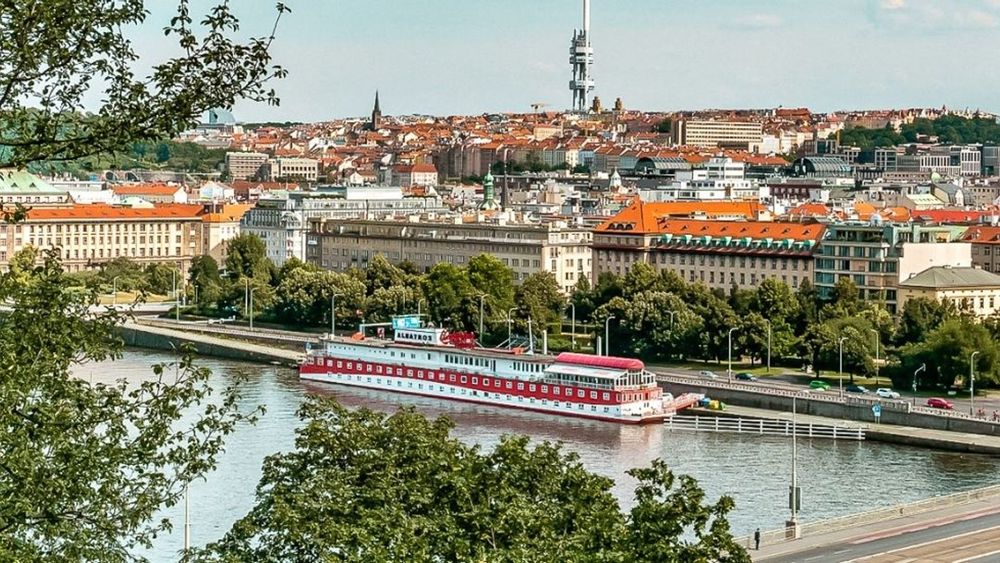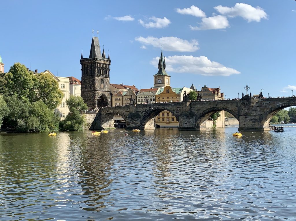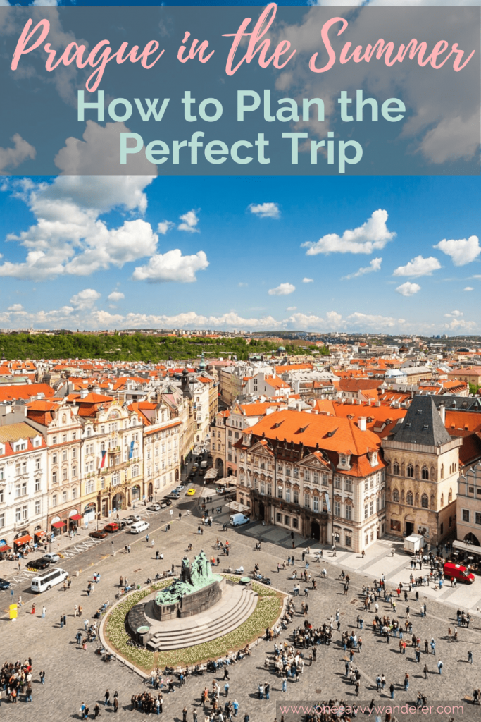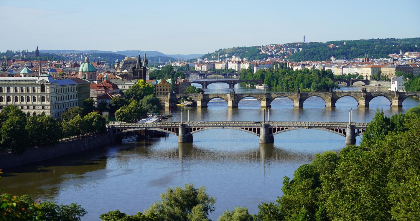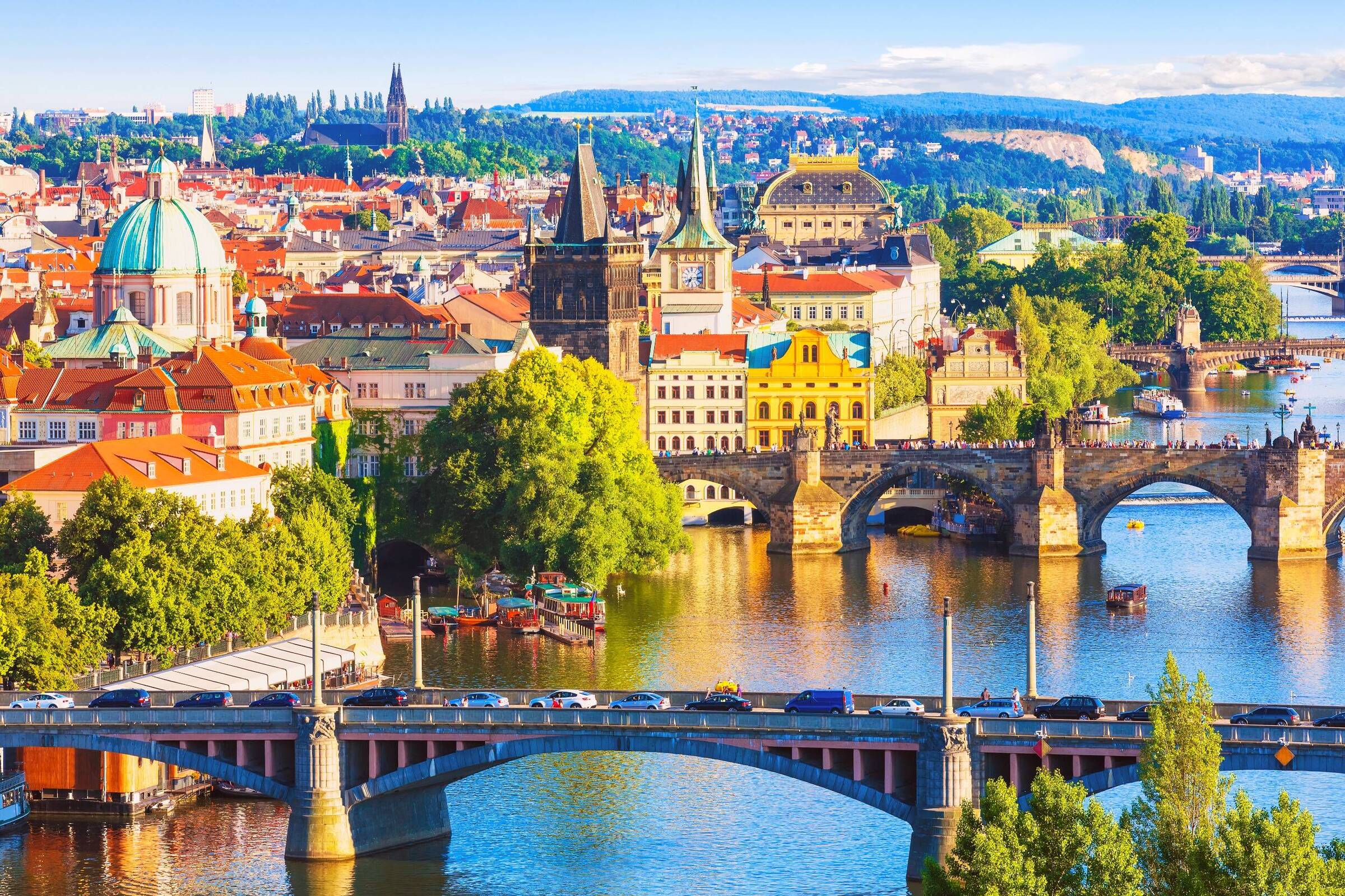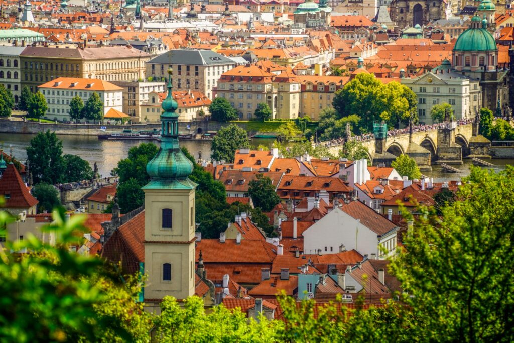 Here is the description: Summer in Prague brings warmth and vitality to the city's historic streets The Charles Bridge, lined with statues and street performers, takes on a festive air River Vltava's gentle currents carry boats and sunbathers alike Green spaces like PetΕΓn Hill offer panoramic views of the city Cafes and beer gardens bustle with laughter and conversation The smell of freshly baked trdelnΓk wafts through the air, enticing passersby