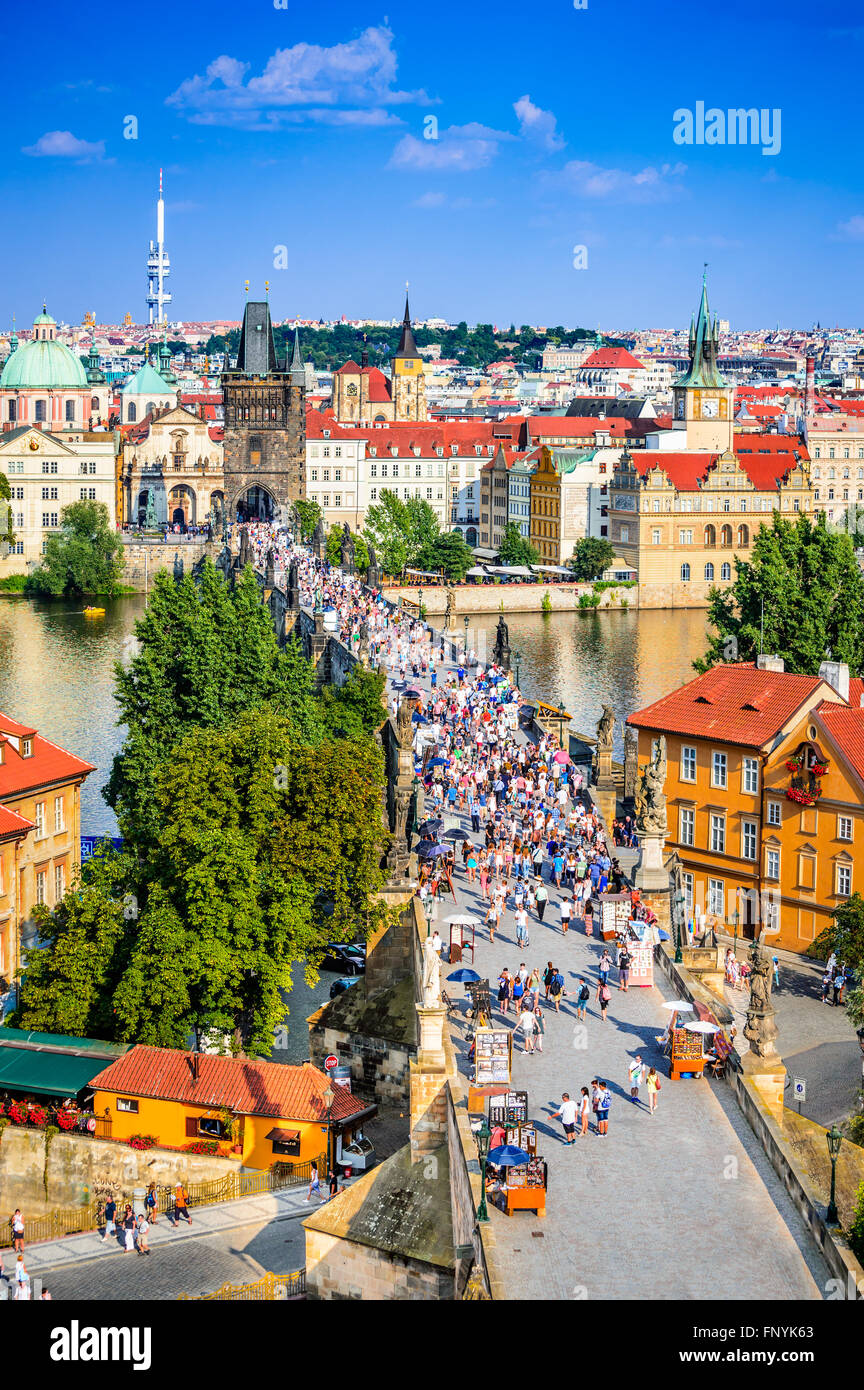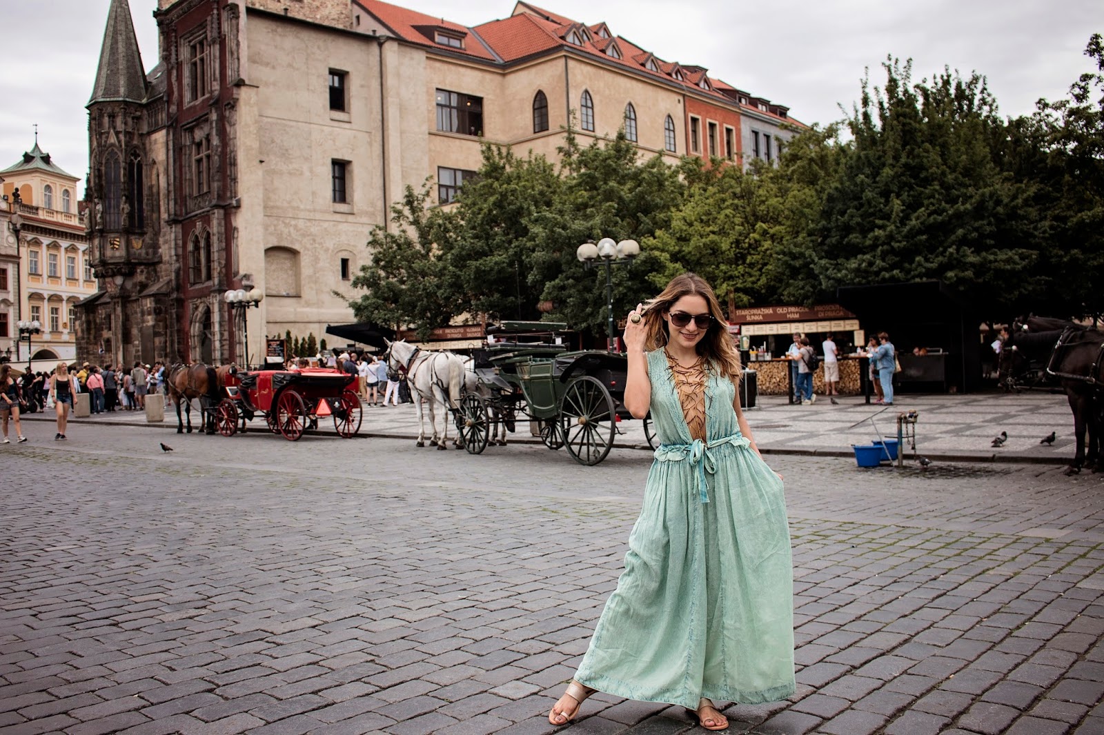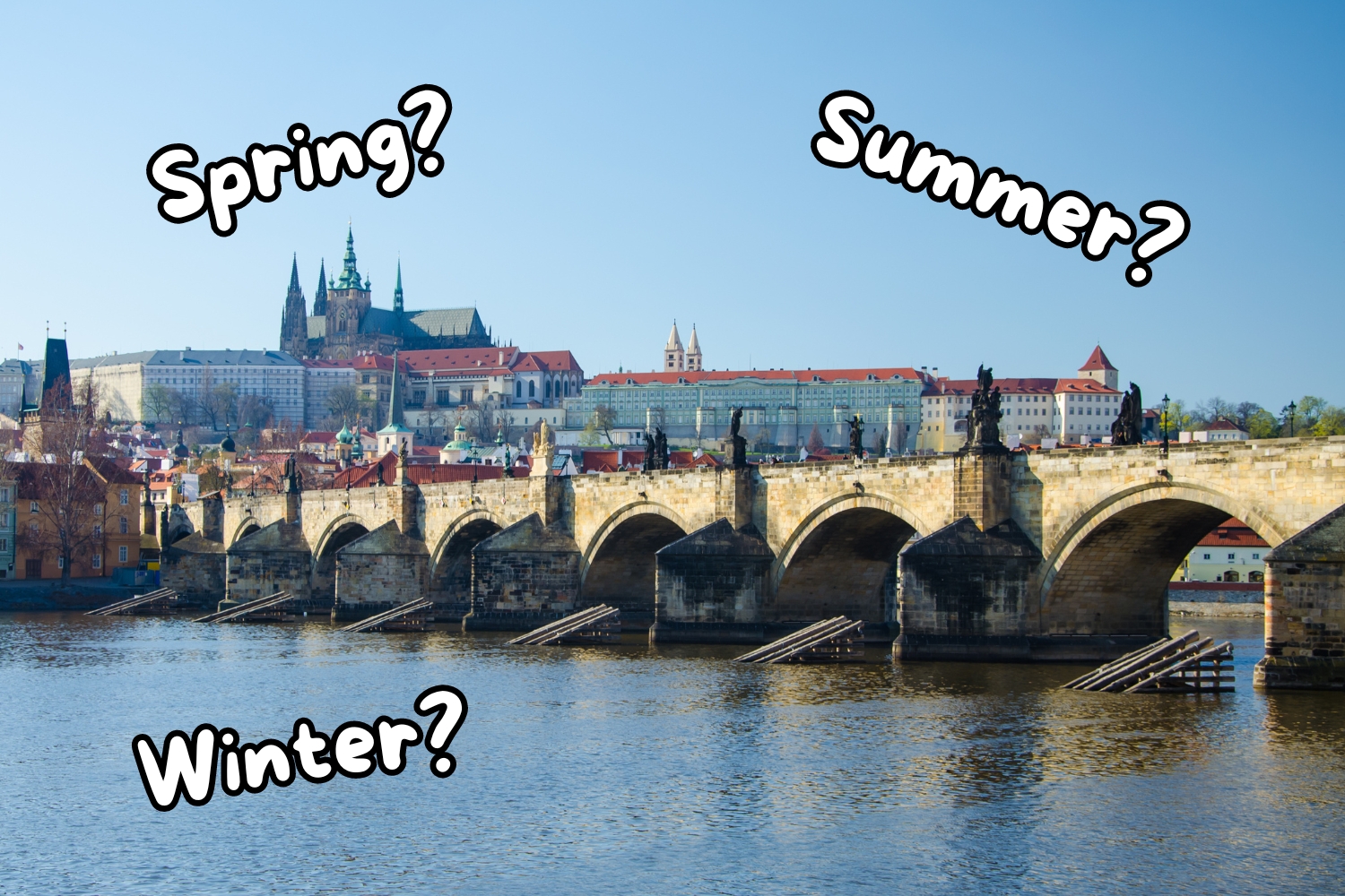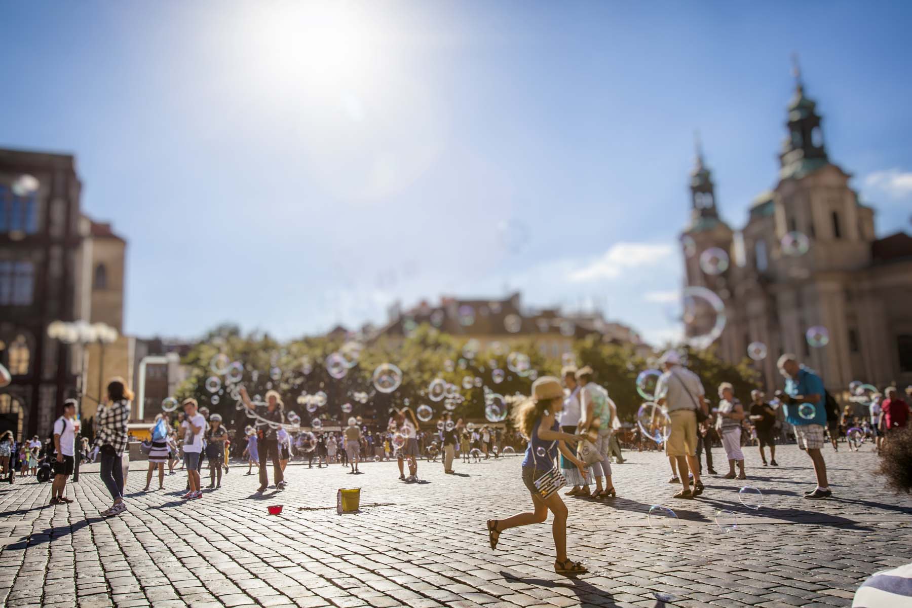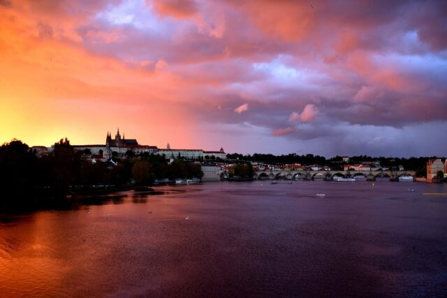 Here is the description: Summer in Prague brings warmth and vitality to the city's historic streets The Charles Bridge, lined with statues and street performers, takes on a festive air River Vltava's gentle currents carry boats and sunbathers alike Green spaces like PetΕΓn Hill offer panoramic views of the city Cafes and beer gardens bustle with laughter and conversation The smell of freshly baked trdelnΓk wafts through the air, enticing passersby