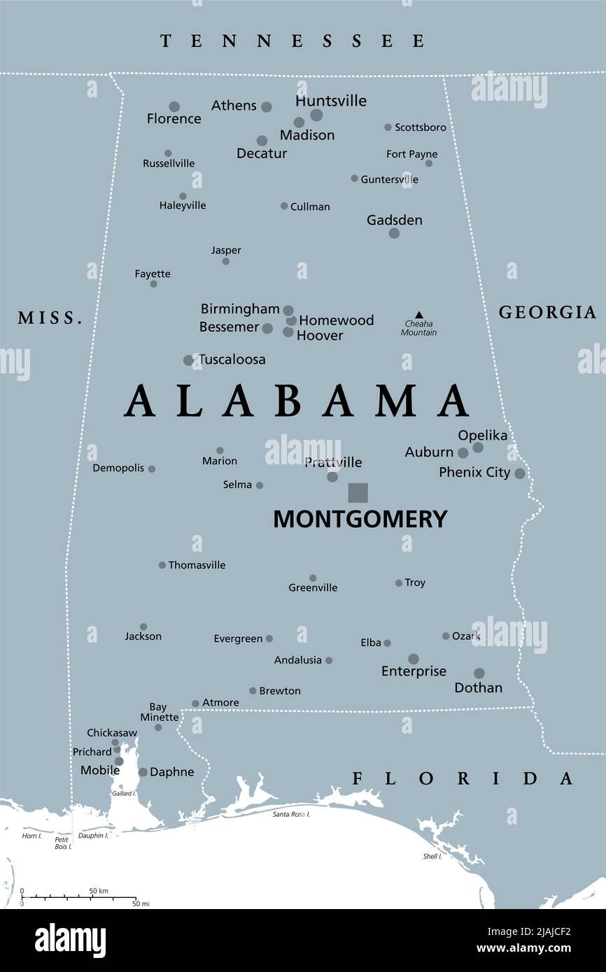 Alabama is a state located in the southeastern United States. It borders Florida to the south, Georgia to the east, and Mississippi to the west and southwest. The capital city of Alabama is Montgomery, while the largest city is Birmingham. The state is known for its rich musical heritage, particularly in genres like jazz, gospel, blues, and country. Alabama has a diverse geography, with mountains, forests, and coastal areas along the Gulf of Mexico.