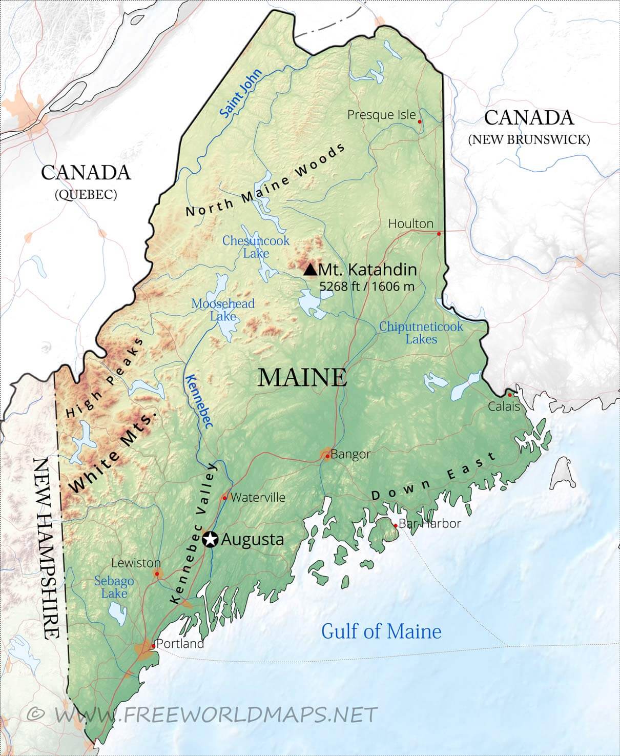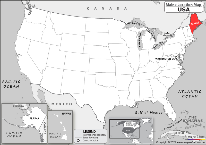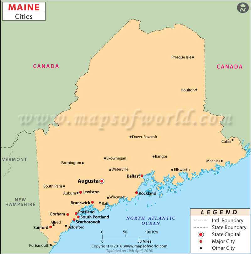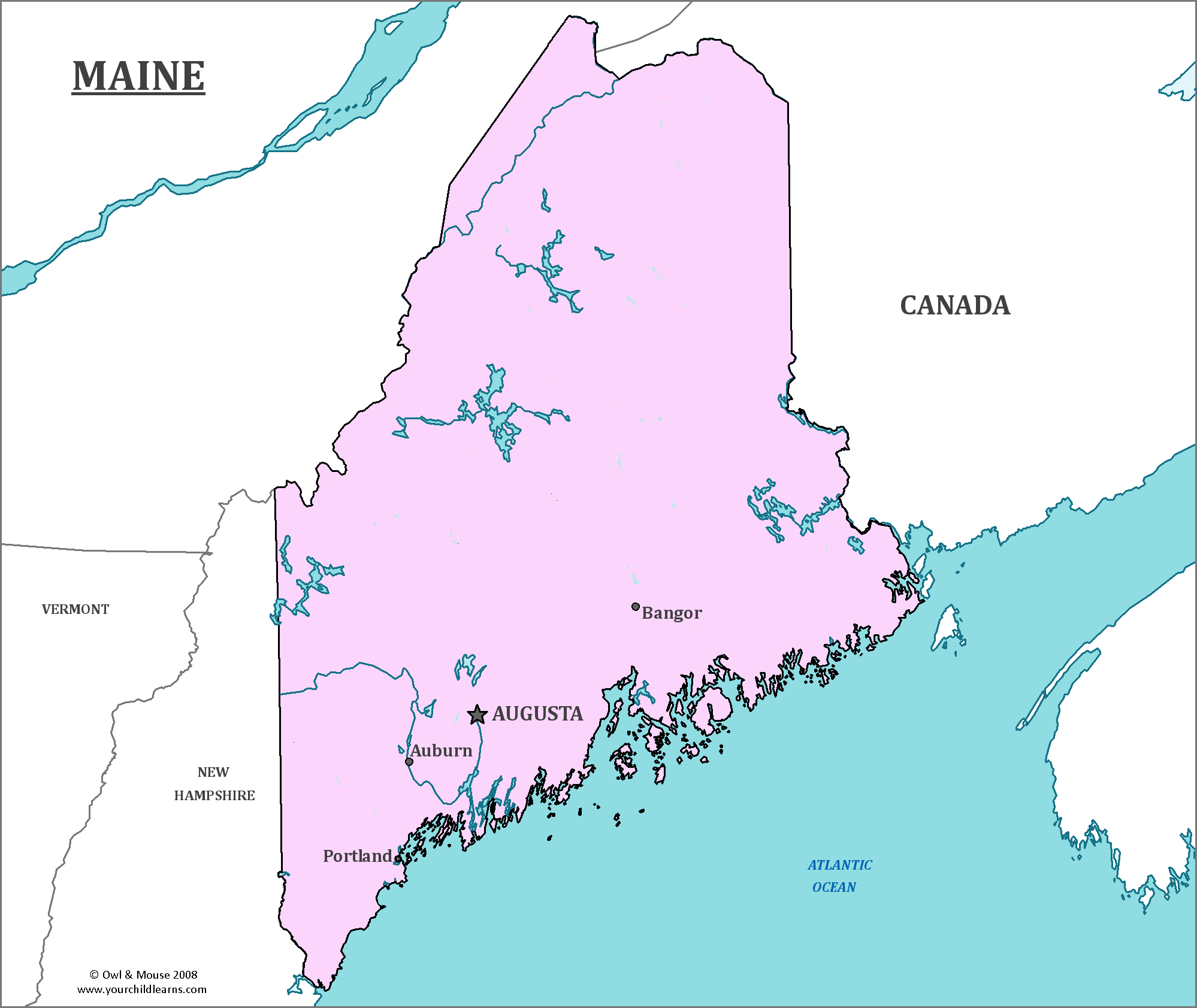 Maine is a state located in the northeastern United States. It is bordered by New Hampshire and Quebec, Canada, to the west and northwest respectively. Maine has a rugged coastline along the Atlantic Ocean and a dense forest interior. The state capital is Augusta, while the largest city is Portland. Maine is known for its blueberries, lobsters, and potatoes as well as its natural beauty and outdoor recreation opportunities.
