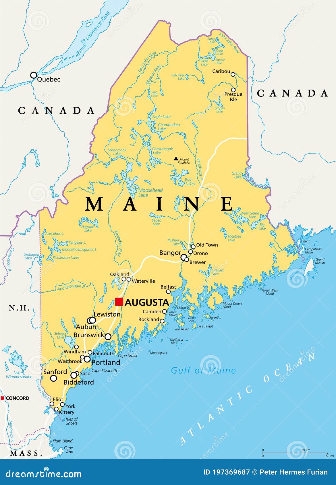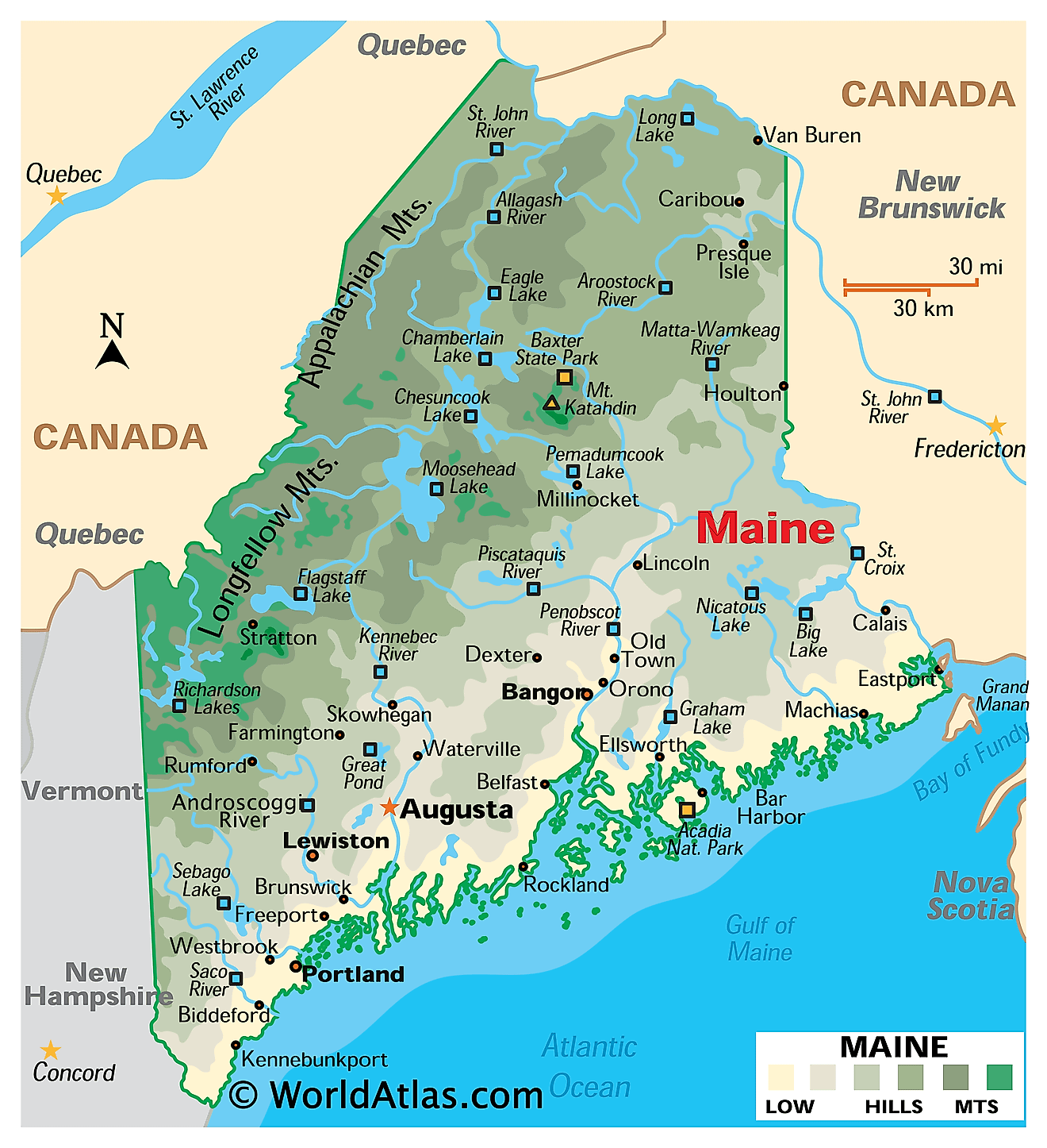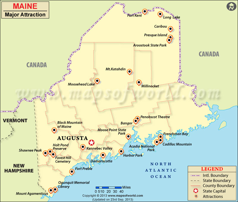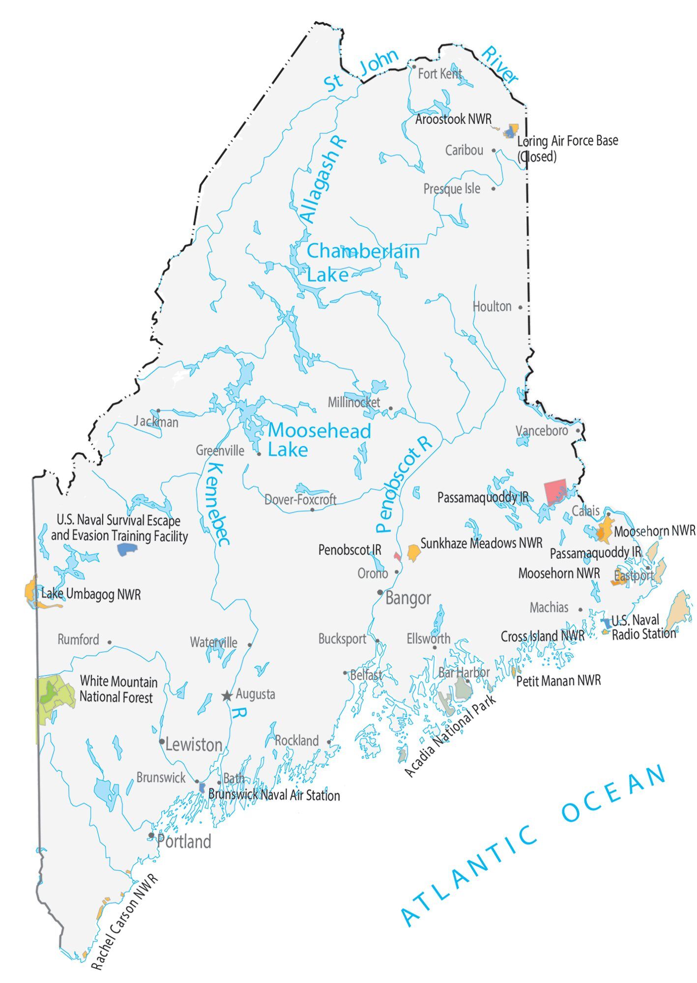 Maine is a state located in the northeastern United States. It is bordered by New Hampshire and Quebec, Canada, to the west and northwest respectively. Maine has a rugged coastline along the Atlantic Ocean and a dense forest interior. The state capital is Augusta, while the largest city is Portland. Maine is known for its blueberries, lobsters, and potatoes as well as its natural beauty and outdoor recreation opportunities.