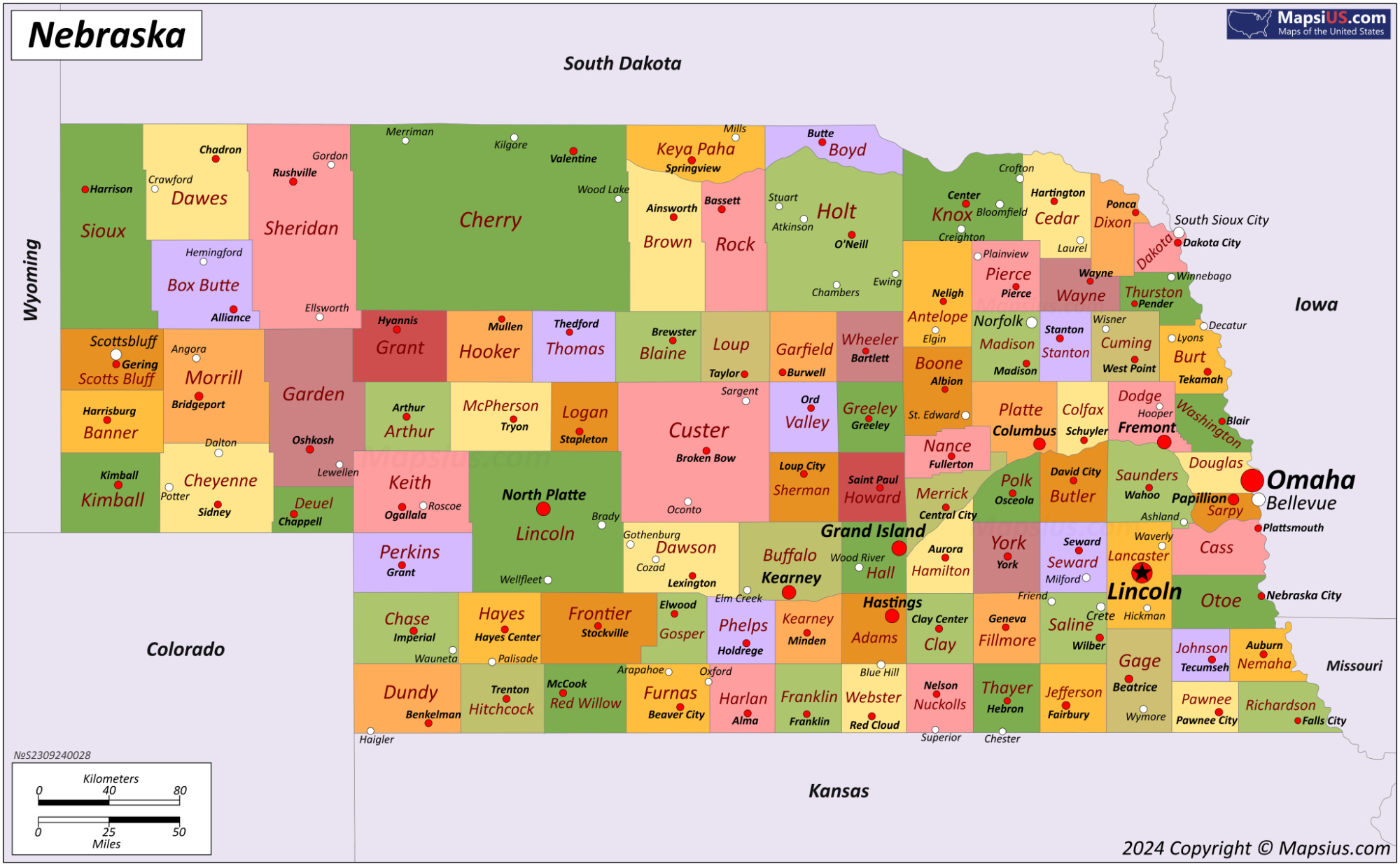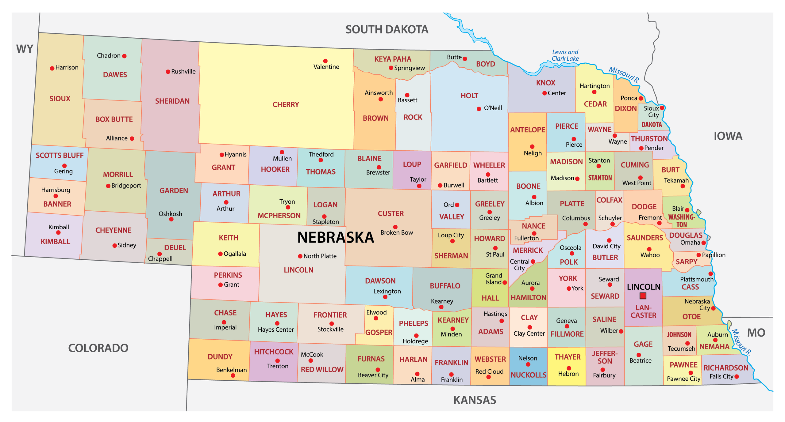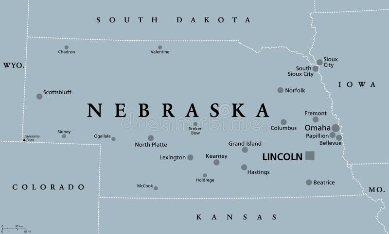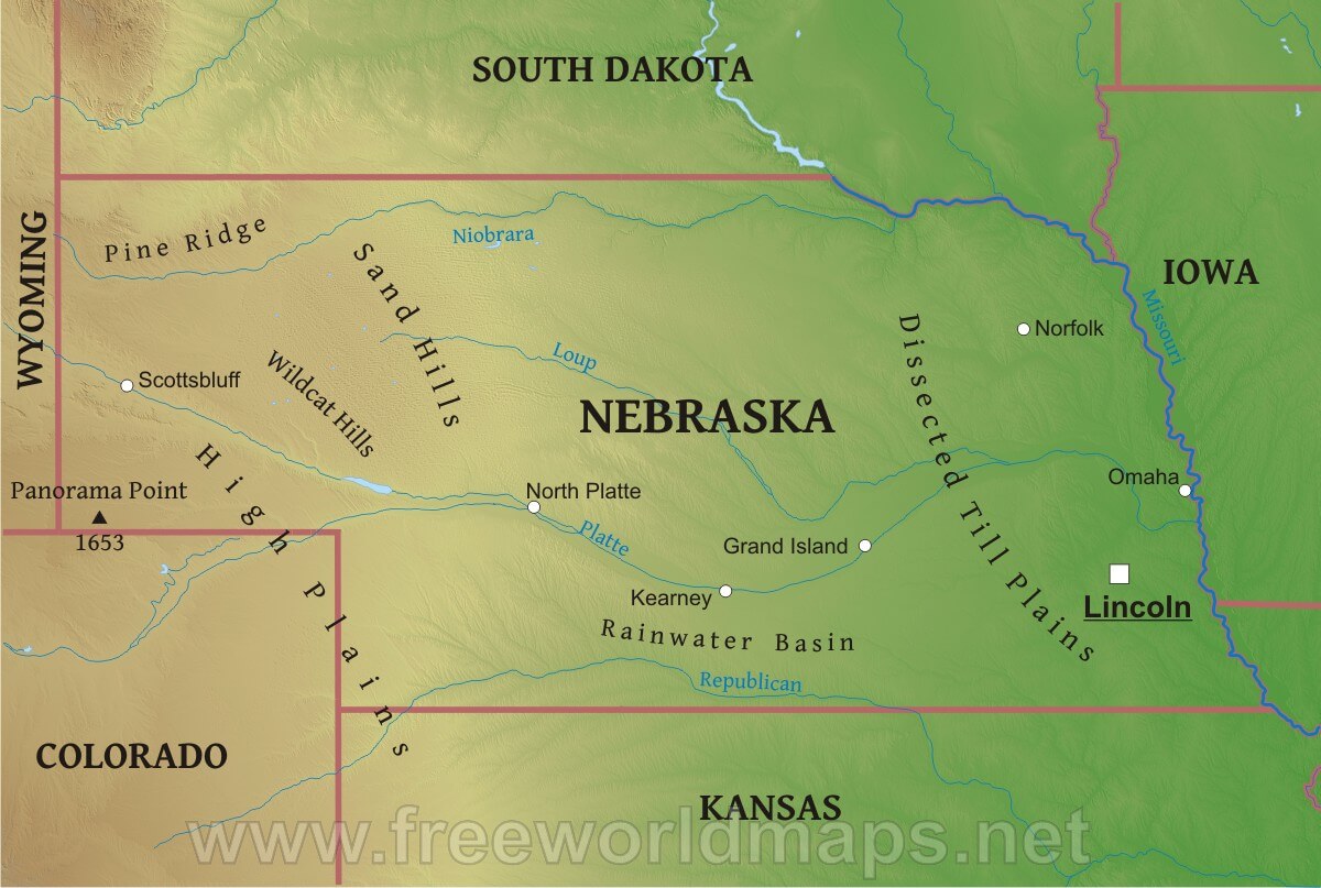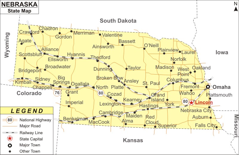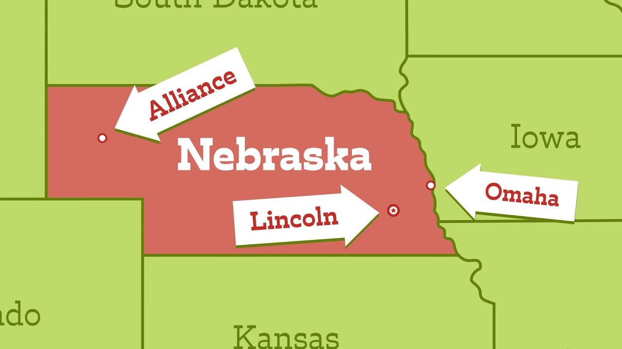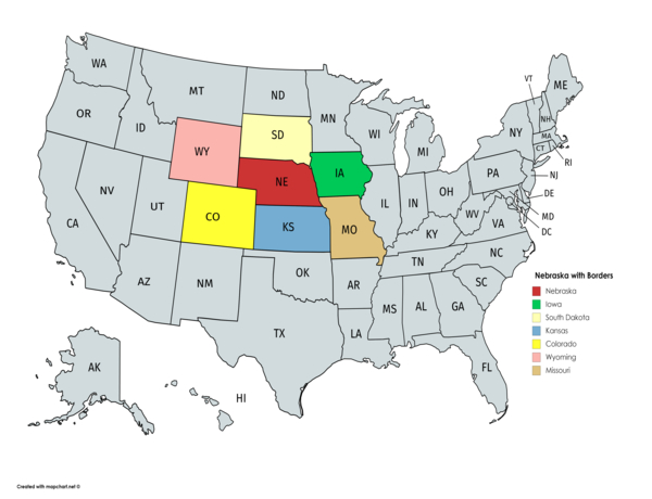 Nebraska is a Midwestern state in the United States, bordering Iowa to the east and Kansas to the south. It shares borders with South Dakota and Wyoming to the west, and Colorado to the southwest. The state capital is Lincoln, and its largest city is Omaha, which is home to Kool-Aid and Warren Buffett's Berkshire Hathaway headquarters. Nebraska is known for its Great Plains terrain, rolling hills, and wide open spaces, with the Missouri River forming its eastern border. Agriculture is a significant sector of the state's economy, with corn, soybeans, and cattle being major productions.