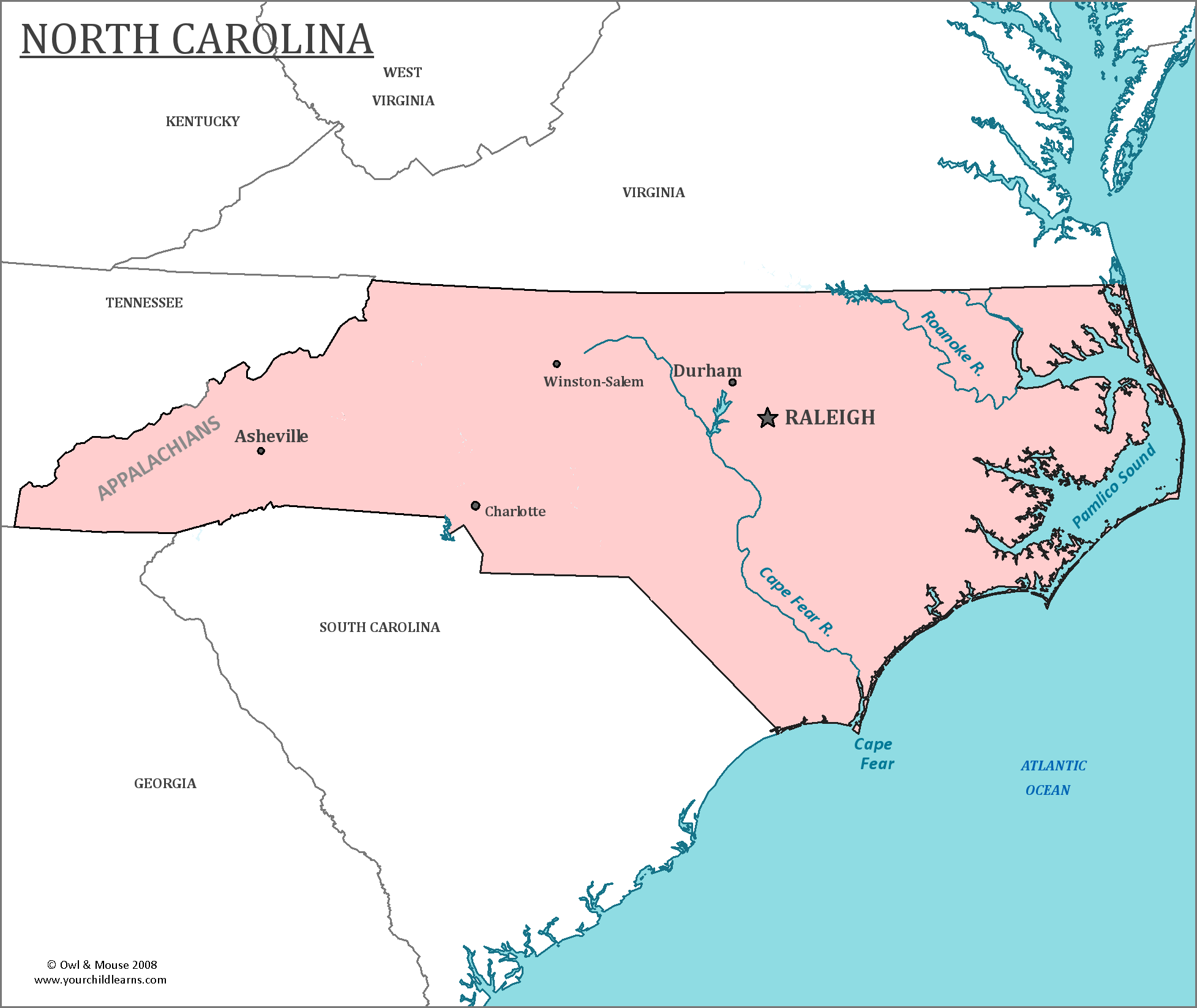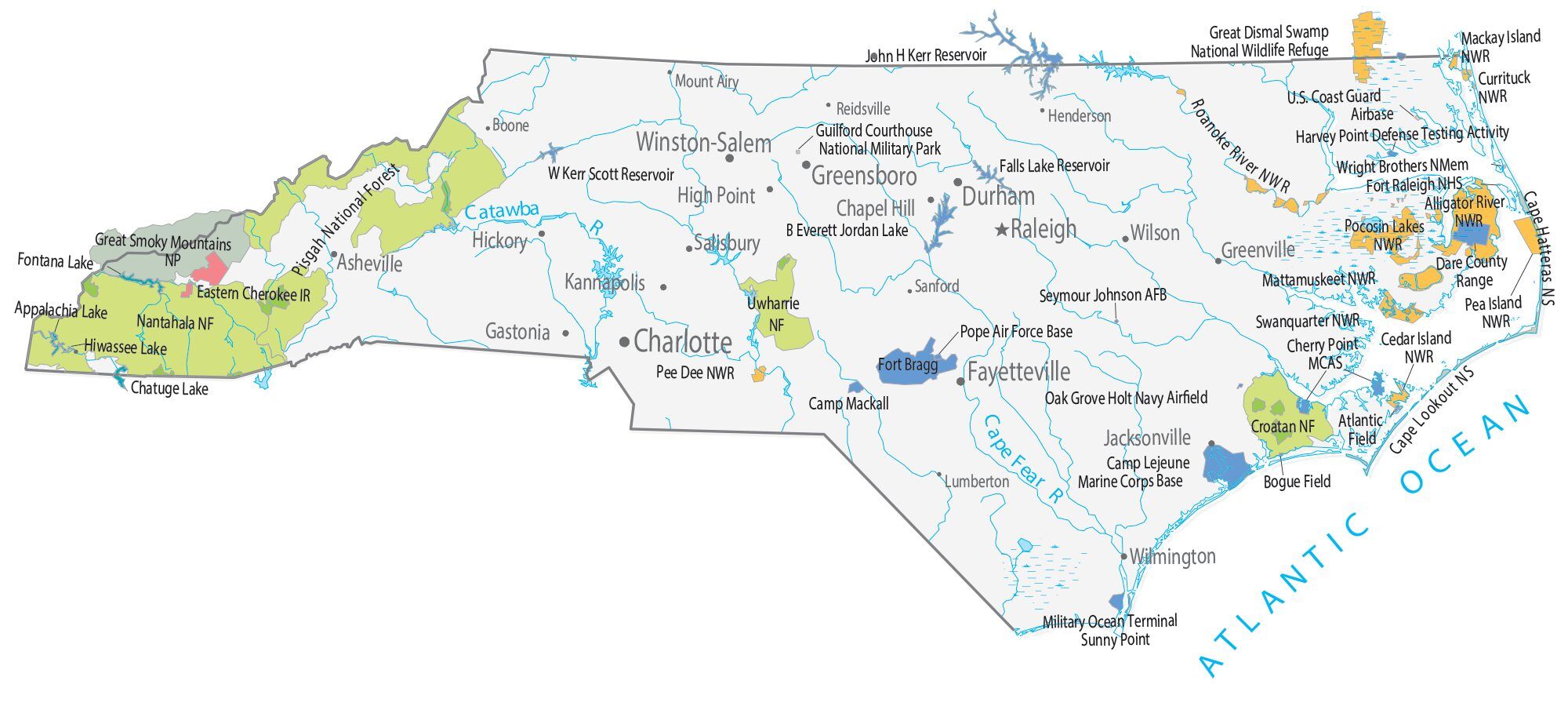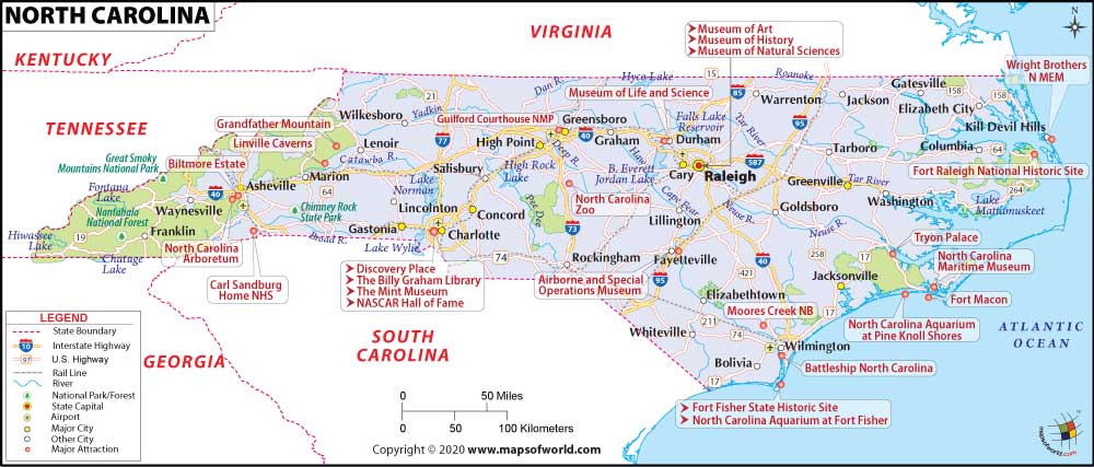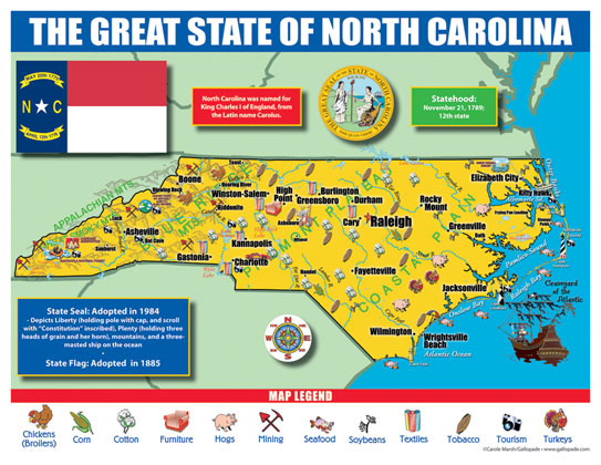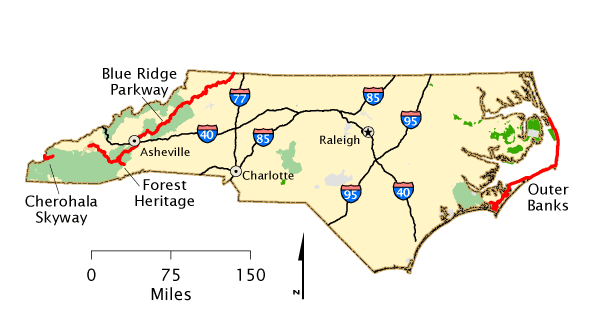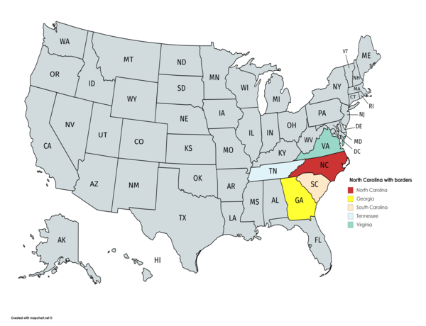 North Carolina is a state located in the southeastern United States. It shares borders with Virginia, Tennessee, South Carolina, and Georgia The capital city is Raleigh, and the largest city is Charlotte The state is known for its scenic beaches along the Atlantic coast Mountain ranges like the Great Smoky Mountains offer hiking and skiing opportunities Historic sites like Wrightsville Beach and the Outer Banks are popular tourist destinations