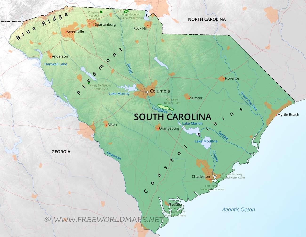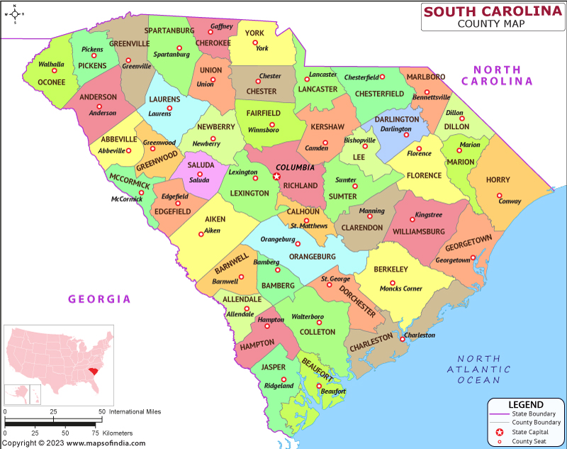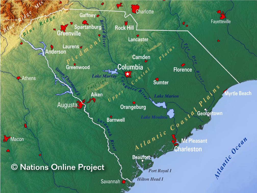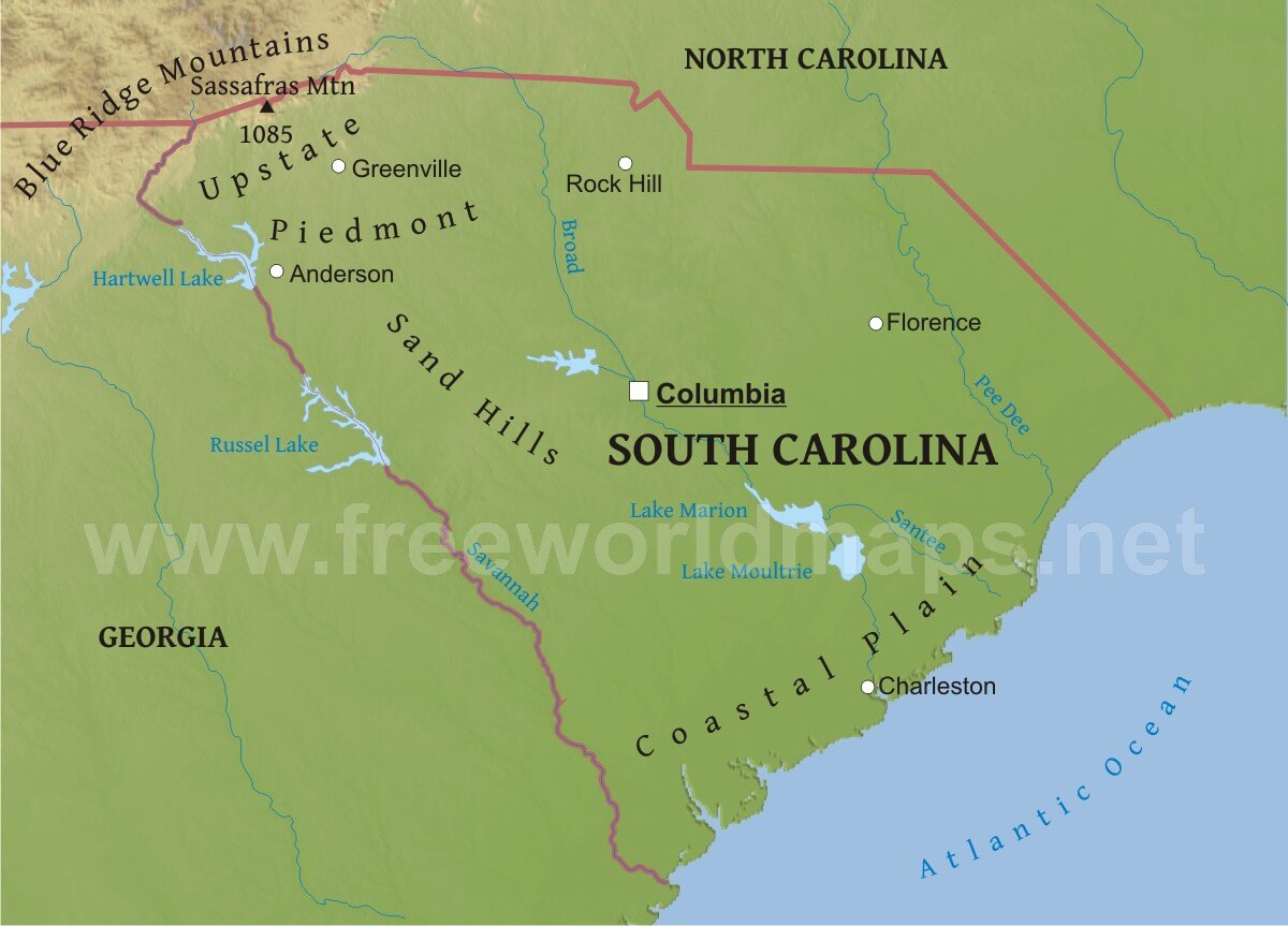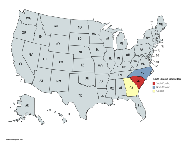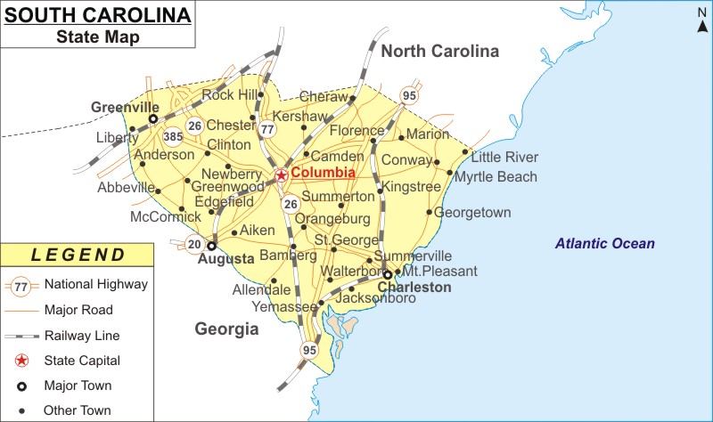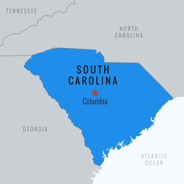 South Carolina is a state located in the southeastern United States. It borders North Carolina to the north, Georgia to the west, and the Atlantic Ocean to the east. The capital city of South Carolina is Columbia, which is situated about 100 miles inland from Charleston, a major port city. South Carolina is known for its rich history, including being one of the original thirteen colonies and playing a significant role in the American Civil War. The state's economy is driven by industries such as manufacturing, healthcare, and tourism, with tourism being a major contributor to the state's revenue. South Carolina is home to several well-known universities, including Clemson University and the University of South Carolina, both of which have strong athletic programs.